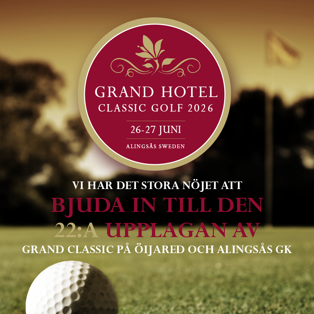 Välkommen till ett golfevent utöver det vanliga, i år spelar vi Grand Hotel Classic för 22:a gången på Alingsås GK och Öijared Resort. Vi spelar greensome 18 + 18 hål poängbogey. Max enskilt hcp 40. Max sammanlagd hcp 72 i laget. 18 år. Två personer per lag. Minst 6 utslag per person och rond ska räknas.